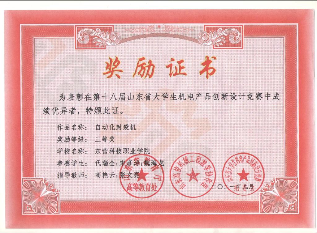 近日,第十八届(2021年)山东省大学生机电产品创新设计竞赛决赛成功举行。万象城万象城娱乐awc线路学生代瑞全、宋彦涛、魏海龙的团队作品《自动化封袋机》荣获三等奖。