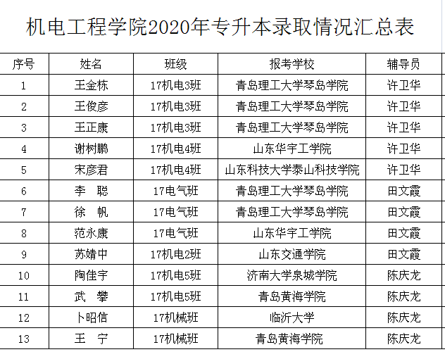 日前,山东省2020年专升本成绩揭晓。万象城娱乐awc线路机电工程学院2020年参加专升本考试共计28人,录取13人,录取率达46.43%。其中王金栋、王俊彦、王正康、李聪、徐帆等考入青岛理工大学琴岛学院;谢树鹏、范永康等考入山东华宇工学院;宋彦君考入山东科技大学泰山科技学院;苏婧中考入山东交通学院;陶佳宇考入济南大学泉城学院;卜昭信考入临沂大学;王宁、武攀等考入青岛黄海学院。