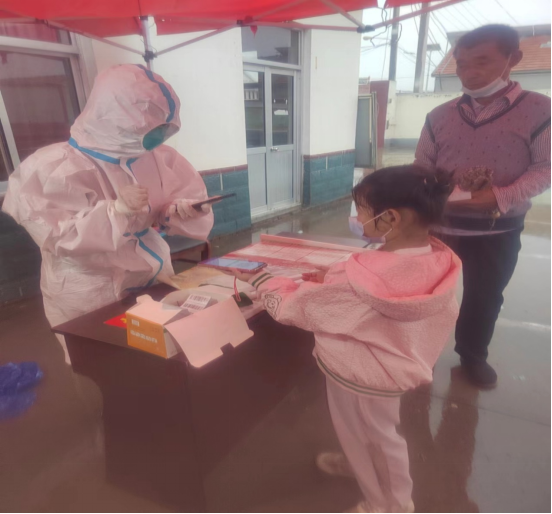 早上5点,田文静老师按照村委的要求来到村委会,正在布置场地时,突然一场大雨倾盆而下,给核酸检测带来了诸多的不便,医护人员、党员干部、志愿者冒雨坚守,核酸检测按时开始,为了加快核酸检测速度,需要一名能快速学会扫码的同志,村长问队伍里面有没有党员,田老师举手示意,村长亲自在她背后写下了“我是党员,田文静”,田老师感到非常荣幸。短暂的培训以后,田老师接过了给村民扫码的任务,群众检测队伍整齐、井然有序,齐心坚守撑起了一张“疫”往无前的守护伞。田文静老师作为党员,充分发挥了党员的模范带头作用,积极投入到疫情防控的志愿服务中去,给万象城师生做了良好的榜样。