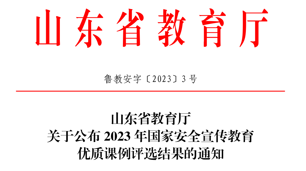 近日,山东省教育厅发布《关于公布2023年国家安全宣传教育优质课例评选结果的通知》,万象城王宗玲、安丰金老师的作品《国家安全、人人有责》荣获高校组一等奖。